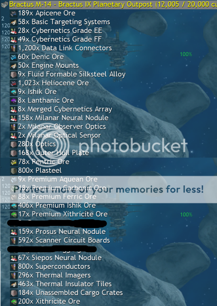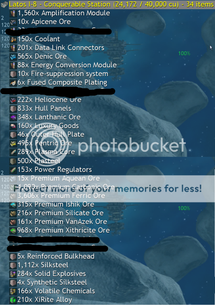 I have consolidated all of my items worth selling into four stations: Latos I-8, Pelatus C-12, Bractus M-14, and Sedina D-14. I will be liquidating every single item from these stations and everything listed below is for sale. For the conquerable stations, I'd like to sell each full inventory as a whole. Please approach me in-game with a price and we can determine if it is appropriate.